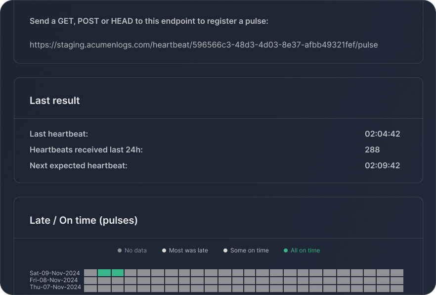 Learn moreSee exactly when and why a heartbeat was missed. View detailed logs and metadata to debug failures fast and prevent future incidents.