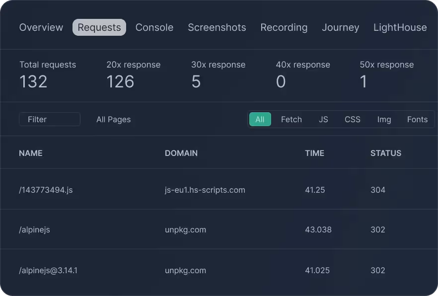 Easily filter test requests by content type (CSS, JavaScript, images, fonts, etc.) and HTTP status, helping you quickly focus on critical metrics without information overload.